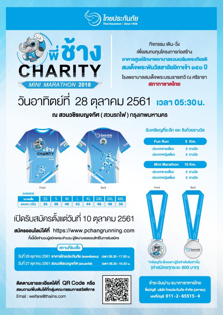 สำหรับผู้ที่สนใจเข้าร่วมการแข่งขันกิจกรรม เดิน – วิ่ง “พี่ช้าง CHARITY MINI MARATHON 2018” สามารถสมัครออนไลน์ได้ที่ http://www.pchangrunning.com ตั้งแต่วันที่ 10 ตุลาคม 2561 ค่าสมัครท่านละ 600 บาท โดยชำระเงินผ่านทาง ธนาคารทหารไทย ชื่อบัญชี บริษัท ไทยประกันภัย จำกัด (มหาชน) เลขที่บัญชี 011-2-65515-4 ทั้งนี้ผู้สมัครสามารถรับเสื้อวิ่งได้ในวันศุกร์ที่ 26 ตุลาคม 2561ณ อาคารไทยประกัน(ซอยหลังสวน) ตั้งแต่เวลา 08.30 – 17.00 น. และวันเสาร์ที่ 27 ตุลาคม 2561 รับได้ที่ สวนวชิรเบญจทิศ (สวนรถไฟ) ตั้งแต่เวลา 08.30 – 16.30 น. นอกจากนี้เพื่อเป็นการขอบคุณผู้เข้าร่วม เดิน – วิ่ง ทำบุญกับเราในกิจกรรมนี้ ทางบริษัท ไทยประกันภัย จำกัด (มหาชน) ได้จัดทำประกันภัยอุบัติเหตุฟรี ให้กับทุกท่านเป็นการพิเศษด้วย