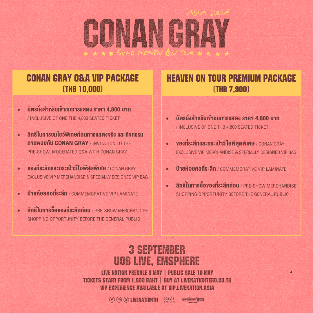 ด้วยประสบการณ์ที่เพิ่มขึ้น และผลงานเพลงจากอัลบั้มใหม่ที่รับประกันความฟิน ได้ยินถึงสวรรค์ของโคนัน เกรย์ แฟน ๆ อย่าลืมเซฟวันกดบัตร แล้วมาเจอกันได้ 3 กันยายนนี้ พิเศษ! สำหรับผู้ถือบัตรมาสเตอร์การ์ดในประเทศไทย สามารถรับสิทธิ์ซื้อบัตรคอนเสิร์ตรอบพรีเซลส์ ได้ตั้งแต่วันอังคารที่ 7 พฤษภาคม เวลา 10.00 น. ถึงวันพฤหัสบดีที่ 9 พฤษภาคม เวลา 10.00 น. และรับสิทธิ์ซื้อบัตรคอนเสิร์ตโซนพิเศษ ได้ตั้งแต่วันศุกร์ที่ 10 พฤษภาคม เวลา 10.00 น. เป็นต้นไป รายละเอียดเพิ่มเติม คลิก www.priceless.com/music